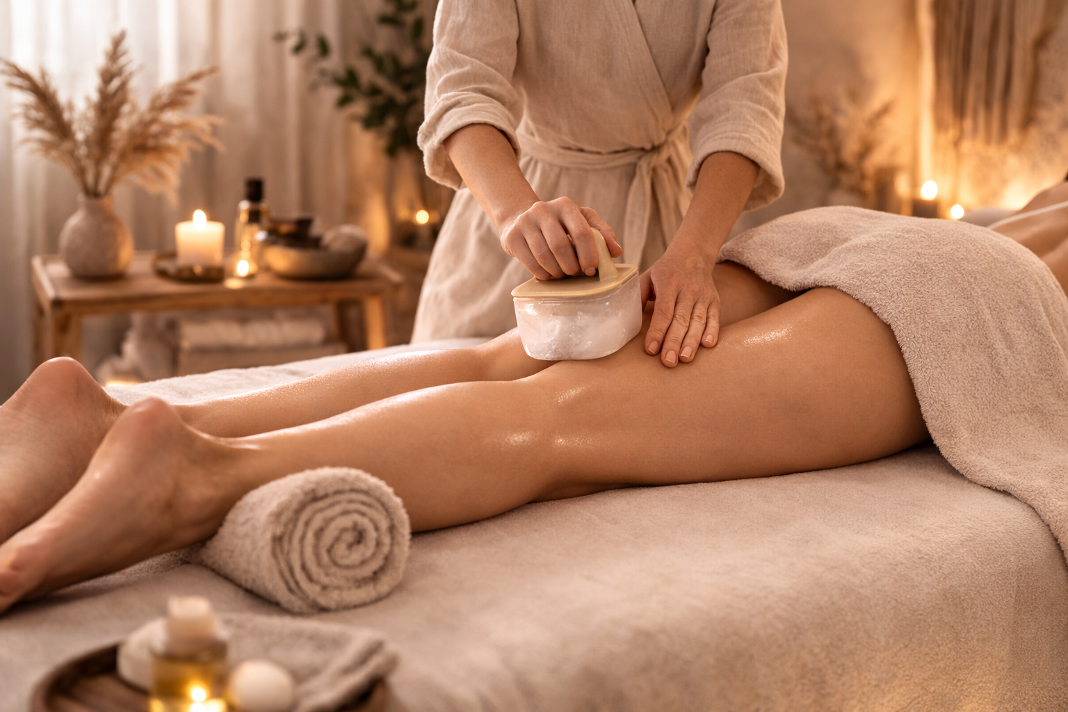 Redukcja przewlekłego napięcia w partiach ud, pośladków, łydek, talii i brzucha. Modelowanie poprzez pracę z powięzią oraz stymulację mikrokrążenia. Wsparcie fizjologii tkanki tłuszczowej poprzez poprawę ukrwienia, drenażu i dotlenienia tkanek. 2 godziny manualnej stymulacji układu krążeniowego i limfatycznego oraz regulacji napięcia układu nerwowego.